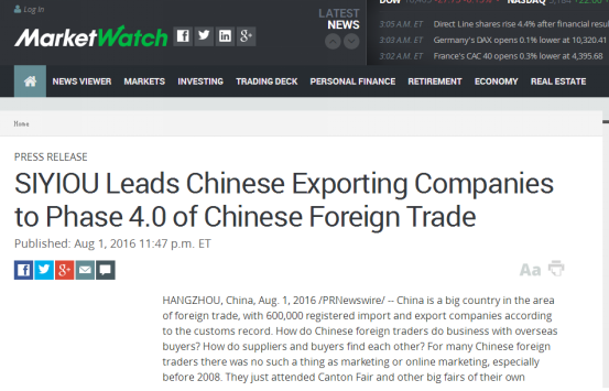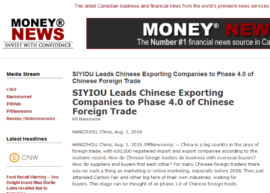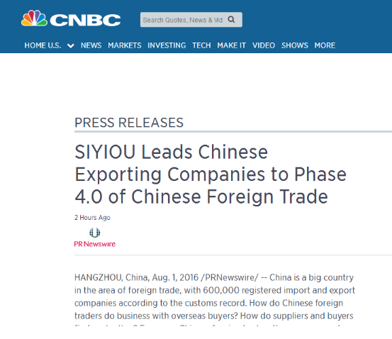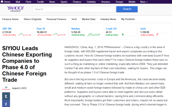 北京時間8月2日下午,美國198家知名財經(jīng)媒體,包括YAHOO FINANCE(雅虎財經(jīng))、CNBC(美國廣播公司財經(jīng)頻道)、Market Watch、Money News、Business Journal、Wall Street Select等,同步發(fā)布了題為SIYIOU Leads Chinese Exporting Companies to Phase 4.0 of Chinese Foreign Trade(思億歐引領(lǐng)中國出口企業(yè)進(jìn)入中國外貿(mào)4.0時代)的報道。
