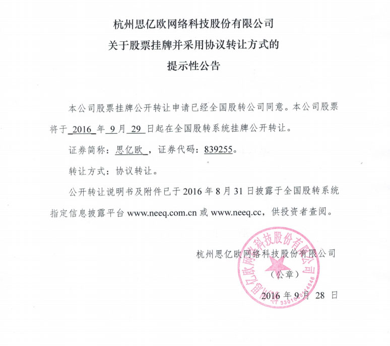 思億歐:關(guān)于公司股票將在全國股份轉(zhuǎn)讓系統(tǒng)掛牌公開轉(zhuǎn)讓的提示性公告