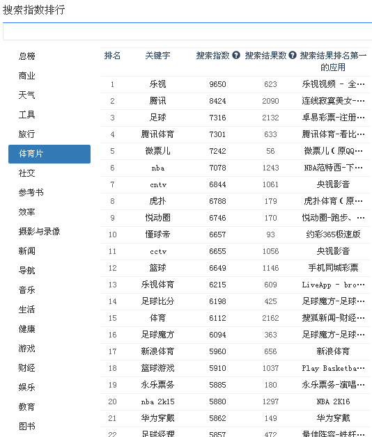 行業(yè)詞:搜索指數(shù)排行,我們可以查看商業(yè)、天氣、工具、旅行、體育、社交等各行業(yè)高指行業(yè)詞,從搜索結(jié)果數(shù)中開發(fā)者可以判斷競爭難度,然后再查看搜索結(jié)果排名第一的應用,了解競爭對手排名與在關鍵詞的一些情況。